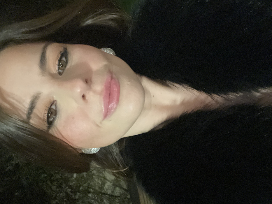 The image presents a close-up, head-on portrait of a female individual, captured at night in Rueil-Malmaison, France. The subject has dark brown hair, parted and falling around her face, and brown eyes with noticeable eyeliner and mascara. Her lips are glossy, light pink, and form a subtle, closed-mouth smile. She wears two prominent, circular, pave-set earrings on her earlobes. Her attire consists of a dark, likely black, textured garment resembling faux fur, visible around her neck and upper chest. The background is dark and heavily blurred, with indistinct shapes on the left suggesting foliage, indicative of an outdoor nighttime setting. The illumination appears to be from a direct, artificial light source, highlighting the subject's face.
