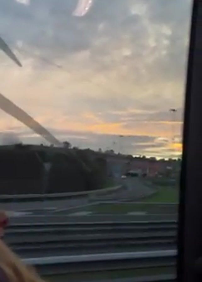 view from a moving vehicle, possibly a train or bus, through a window. Outside, there is a cloudy sky with a sunset visible on the horizon. Below the sky, there is a landscape with trees and buildings, along with a highway where cars are driving. Power lines and pylons are also visible. Inside the vehicle, a person with blonde hair is partially visible near the window. The window appears slightly dirty or scratched, obscuring the view somewhat.