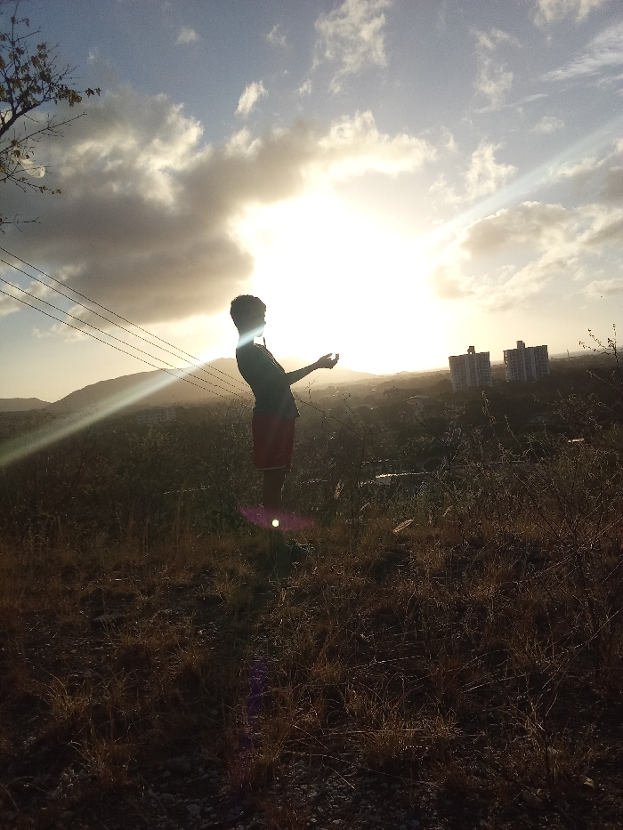 The image depicts an outdoor panoramic scene, likely at sunset or sunrise, overlooking the city of Juan Griego, Venezuela. In the foreground, a single individual, silhouetted by the bright light, stands on an elevated area characterized by dry, sparse, brownish vegetation and visible rocky ground. The subject, appearing to be a young male, is wearing a dark top and red shorts. He is positioned in profile, facing left, with his head tilted slightly upward towards the intense, low-angled sun situated centrally in the upper mid-ground. Both of the subject's arms are raised and bent at the elbows, with hands open and palms facing forward or upward in a distinct gestural posture. Several dark, parallel wires traverse diagonally across the upper left portion of the frame. In the mid-distance, a narrow body of water is visible. The far background presents a landscape of dark, undulating hills and mountains, above which two prominent, light-colored multi-story buildings are distinctly visible on the right. The sky features scattered clouds, with the intense sunlight producing strong backlighting and pronounced lens flares across the entire scene.