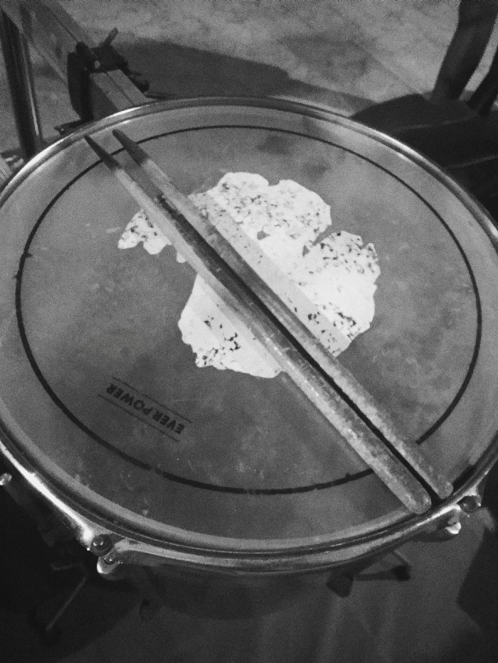 A black and white image presents a drum with two drumsticks laying atop a white, irregularly shaped object in its center. The drumhead, bearing the inscription "EVER POWER," is stretched taut across the drum's metal rim. The drumsticks, appearing used, have a dark line running along their length. The white object in the middle contrasts sharply against the drumhead. The overall composition conveys a sense of musical practice or performance.