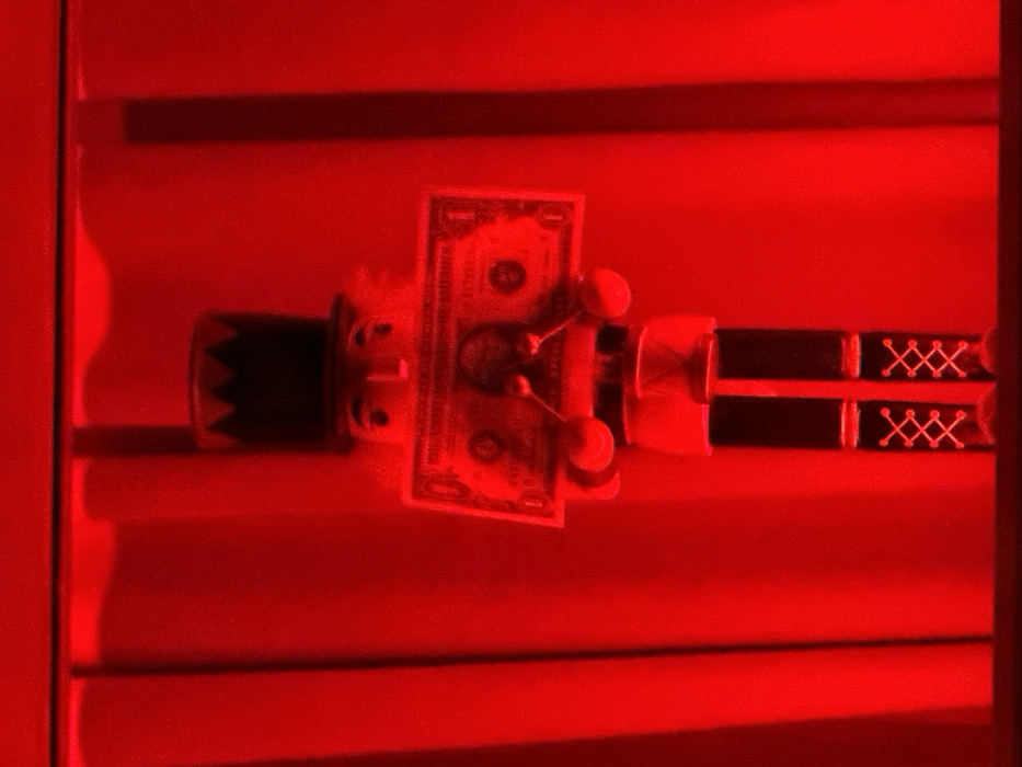 An upright wooden nutcracker figure, approximately one-third the height of the frame, is depicted centrally against a uniformly illuminated red background. The figure wears a dark, possibly black, top hat with a serrated brim and features a stylized face with dark eyes and a pointed nose. It holds a United States one-dollar bill horizontally across its upper body with both hands. The dollar bill displays the number "1" in its corners and the portrait of George Washington, obscured slightly by the red lighting. The nutcracker's lower body consists of two dark, vertical components resembling legs, each marked with three 'X' symbols in white or light-colored stitching at the bottom. The background consists of vertical elements consistent with red draped fabric or panels, illuminated intensely by red light. No specific location within the city of Varna, Bulgaria, is visually identifiable in this indoor scene, which appears to be a staged display.