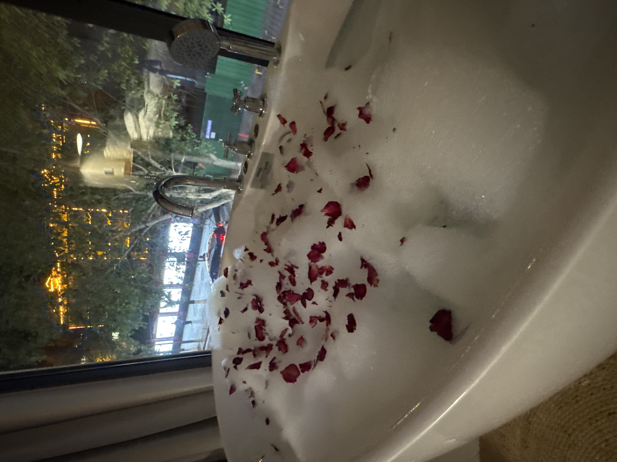 The image displays an interior view of a white bathtub positioned directly beside a large window, overlooking an urban environment at night in Wulingyuan, China. The bathtub is filled with white foam bubbles and is adorned with numerous scattered dark red petals. Chrome bath fixtures, including a gooseneck faucet, two control knobs, and a hand-held showerhead, are mounted on the tub's rim. Outside the window, a wet street or pathway is visible, reflecting ambient light. A dark-colored vehicle with illuminated red taillights is present on the wet surface. At least one human figure, a dark silhouette, is discernible walking on the path. Beyond the path, trees with green foliage partially obscure brightly lit buildings featuring golden-yellow decorative lighting, one of which exhibits a multi-tiered architectural style. Green construction barriers or fencing are visible on the right side of the exterior view. The scene is illuminated by artificial light sources from the buildings and street, indicating nighttime conditions. No individuals are visible within the interior space.