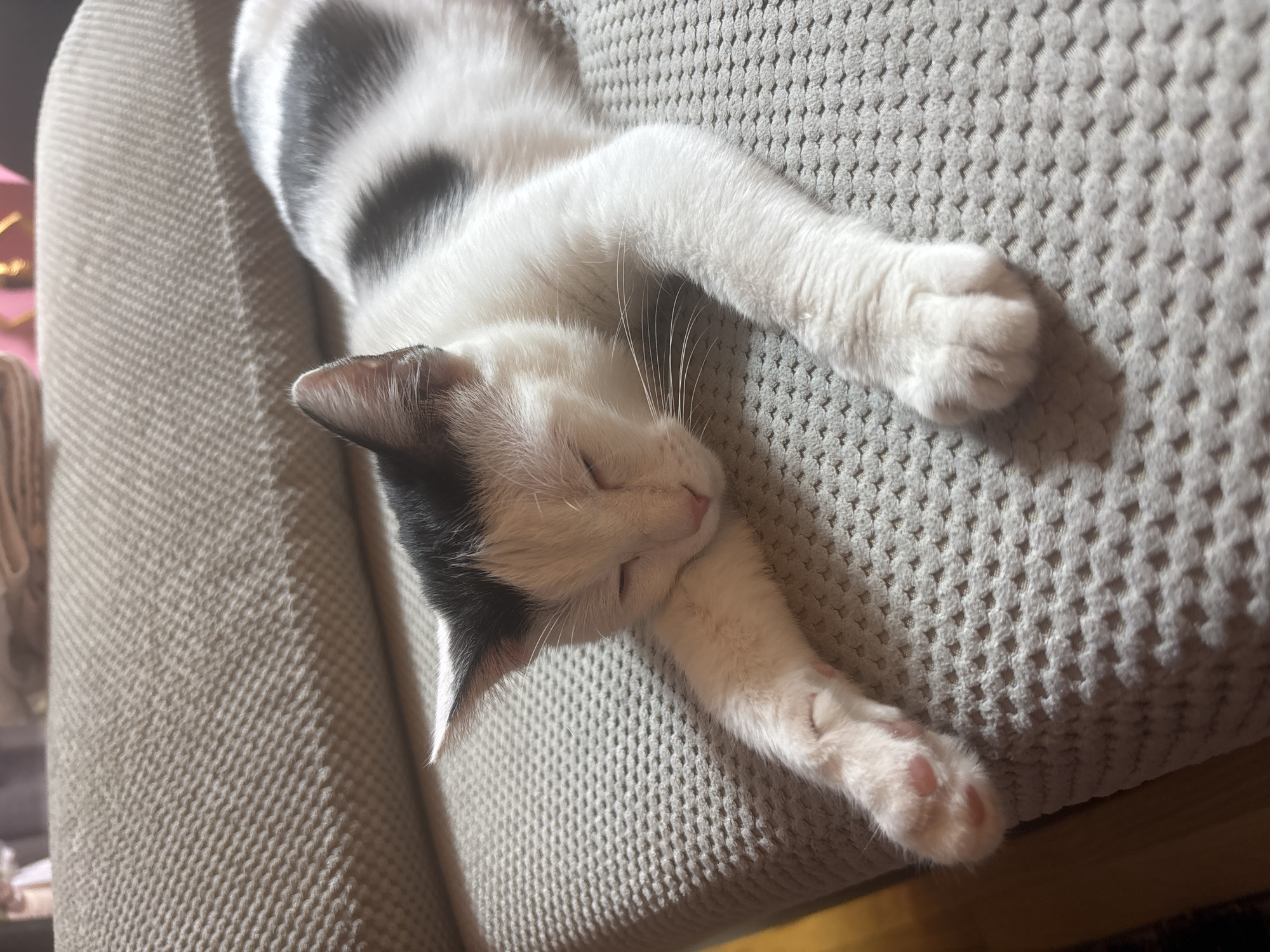 black and white cat sleeping on a gray woven fabric surface, possibly a chair or sofa