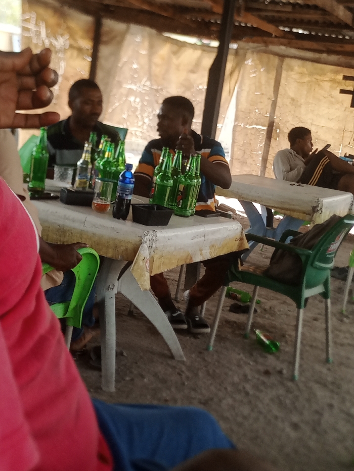 The scene depicts an informal outdoor or semi-outdoor establishment in Adankolo, Nigeria