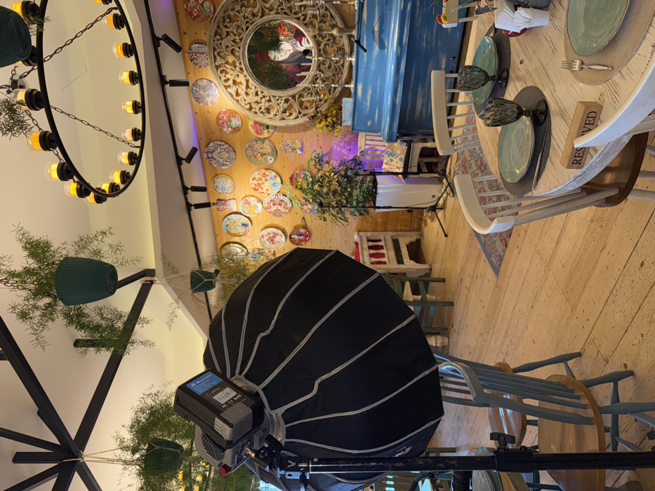 This image depicts the interior of a commercial establishment, likely a restaurant or cafe, located in Tsakhkadzor, Armenia. In the left foreground, a professional photography strobe with an attached black softbox on a stand is prominently positioned. The midground features several dining tables with mixed wooden chairs; one circular table in the immediate right foreground is set for two with light blue plates, dark green goblets, silverware, and a wooden "RESERVED" sign. The flooring consists of light-colored wooden planks. The background wall, constructed from horizontal wooden panels, is elaborately decorated with numerous colorful, patterned decorative plates. To the right, a large, ornate, carved wooden mirror reflects the distorted image of a person, likely female, with dark hair and a red head covering or hat, holding a mobile phone to her face. Below the mirror is a distressed light blue upright piano, topped with multiple candlesticks and small floral arrangements. Various potted green plants are scattered throughout the space, including larger ones in white planters on the floor and smaller ones hanging from the ceiling. Overhead, a large circular chandelier with multiple amber-lit bulbs hangs alongside modern track lighting and exposed structural beams. The overall lighting is warm and artificial.