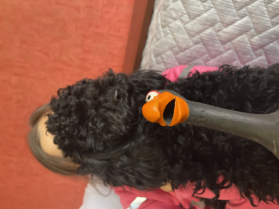The image depicts an indoor scene in Elhovo, Bulgaria. A black, curly-haired dog, likely a poodle or similar breed, occupies the center of the frame, its face mostly obscured by its fur, with only its nose clearly visible. The dog is positioned in front of a person whose forehead, brown hair, and left shoulder, clad in a pink long-sleeved top with a white stripe, are visible behind the animal. In the immediate foreground, a dark grey rubber squeaky toy, resembling a goose or duck with an orange, open beak and visible white and pink-outlined eyes, is held upright, directed towards the camera. To the right of the dog, a portion of a light grey, diamond-quilted surface, consistent with a sofa or cushion, is present. The background features a textured, reddish-orange wall.