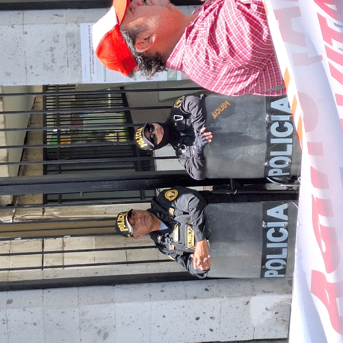 The image depicts a scene outside a public or administrative building in Miraflores, Peru, likely the Municipalidad de Miraflores or a nearby government office, given the formal stone facade and the context of public assembly