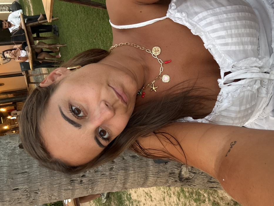 The image captures a selfie of a young woman taken in an outdoor dining area within Thalaramba, Sri Lanka. The primary subject is a woman with long brown hair, brown eyes, and a tanned complexion, wearing a white ruffled strappy top. She has gold hoop earrings and a gold chain necklace featuring multiple charms: red cherries, a gold starfish, a pink heart, a gold coin-like disk, and a red chili pepper. A small, dark wave or script tattoo is visible on her right inner forearm. She is looking directly into the camera with a neutral expression. In the background, a segment of a palm tree trunk is visible on the left, next to a manicured grassy area. Further back, two individuals are seated at a light wooden table. A woman with dark hair, wearing a patterned top, is holding a smartphone at arm's length, seemingly taking a photograph. Beside her, a man with dark hair and a beard, wearing a light-colored collared shirt, is seated and appears to be looking down. A dark bag rests on their table. Behind them, a building with warm interior lighting and a textured facade suggests a cafe or restaurant setting.