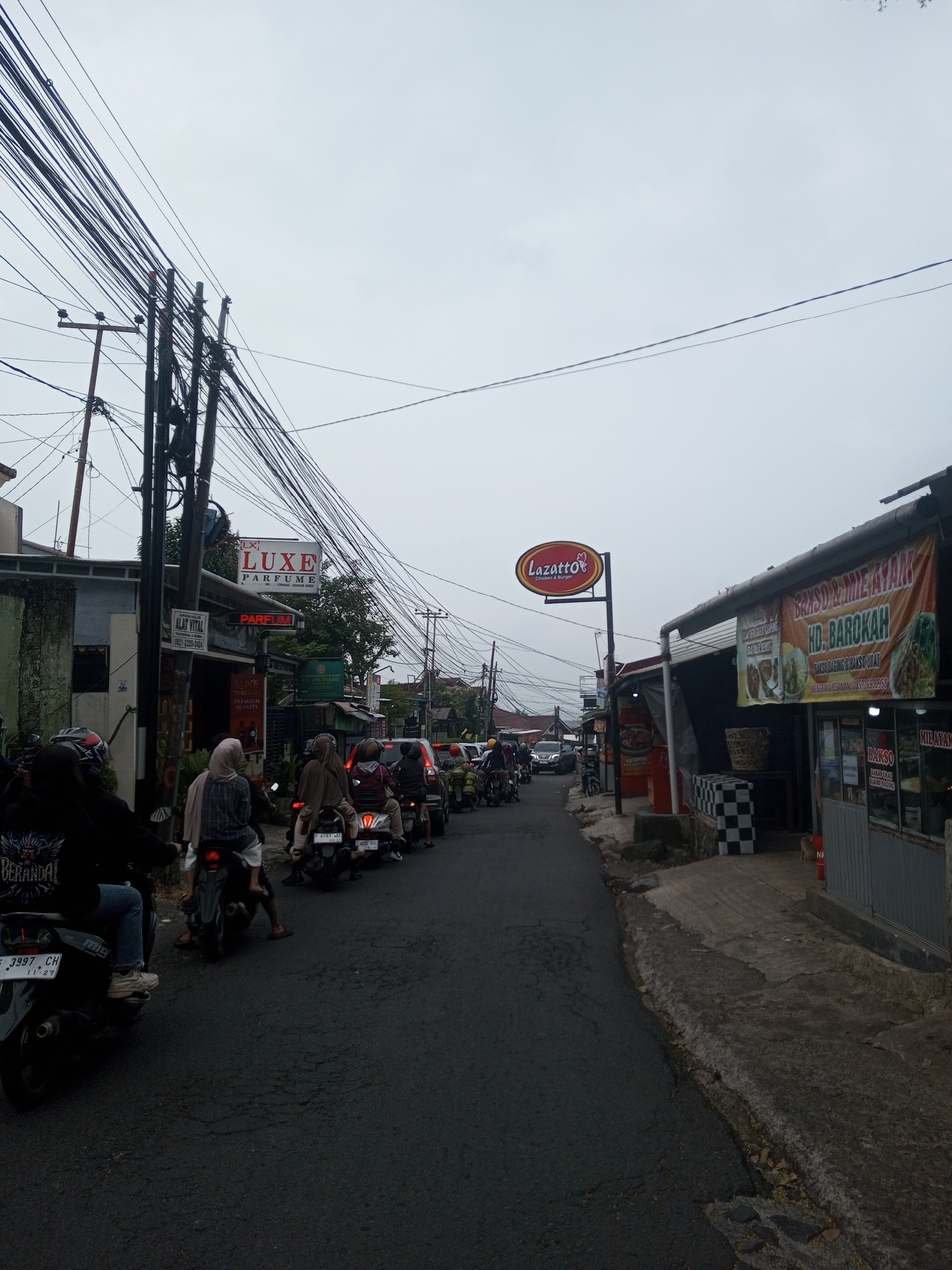 The image captures a congested street scene in the city of Houaythat, Laos, under an overcast sky. An asphalt road, appearing worn, is filled with stationary traffic, predominantly motorcycles and scooters, with a few cars visible further down the street. Multiple individuals are seated on the motorcycles, some wearing helmets, others with head coverings. On the left side of the street, a building houses commercial establishments. Prominent signage, primarily in Indonesian, includes "LUXE PARFUME" and "ALAT VITAL" with a phone number "0821-2290-0424." A dense array of black utility wires crisscrosses overhead, supported by several utility poles. On the right side of the street, a red and yellow sign for "Lazatto Chicken & Burger" is affixed to a pole. Adjacent to it, a large banner, also in Indonesian, advertises "BAKSO & MIE AYAM HD. BAROKAH," featuring images of food items. The ground near the sidewalk on the right shows uneven concrete and a low wall or counter with a black and white checkered pattern.