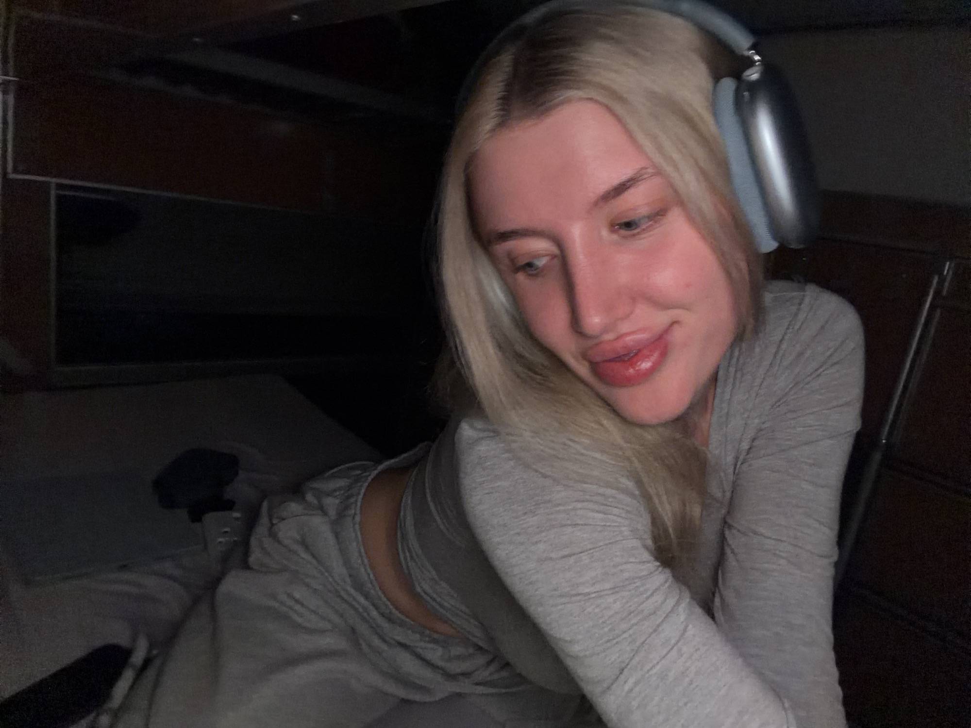 The scene is an interior room, identified as being in the city of Boljevići, Montenegro. The environment is dimly lit. Dark brown wooden paneling or furniture structures are visible along the walls and upper portion of the background. A light-colored surface, appearing to be a mattress or bedding, occupies the lower and mid-left section of the frame. A single female individual with light blonde hair and fair skin is positioned prone on the light surface, her head and upper torso angled towards the left. She is wearing a light gray long-sleeved top and matching light gray loungewear pants. Silver-colored over-ear headphones with light blue earcups are worn on her head. Her head is slightly tilted downwards and to her right, with her blue or grey eyes directed off-frame. Her lips, appearing full and glossy with a reddish tint, are slightly parted. Her expression suggests a subtle smirk or smile. Her left arm is bent, supporting her upper body, with a portion of her lower back exposed between her top and pants. The right side of her body and her right arm are largely obscured.