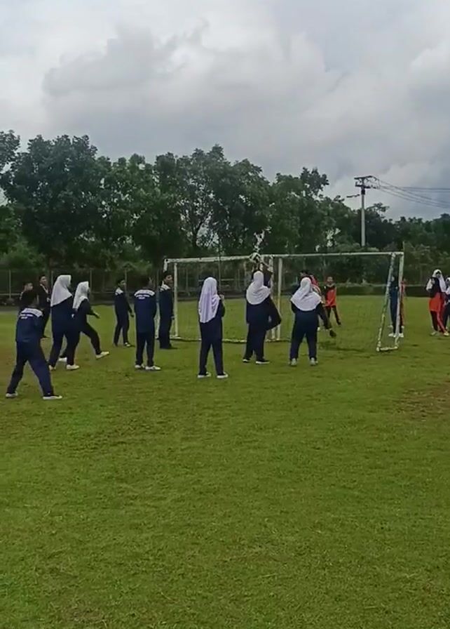 group of young women playing a game that appears to be a form of volleyball on a grassy field. Most of the women are wearing dark blue tracksuits and white hijabs. A few are wearing orange shirts. They are positioned around a set of soccer goals. The ball is in the air, and some of the women are attempting to hit it. The sky is cloudy, and there are trees in the background.