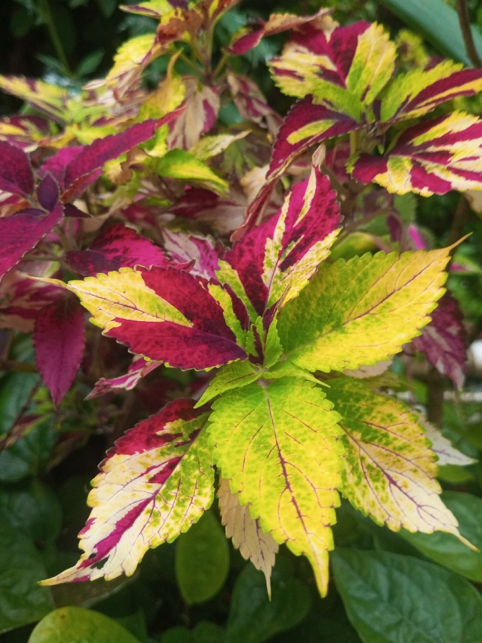 A vibrant cluster of Coleus plants showcases multicolored foliage