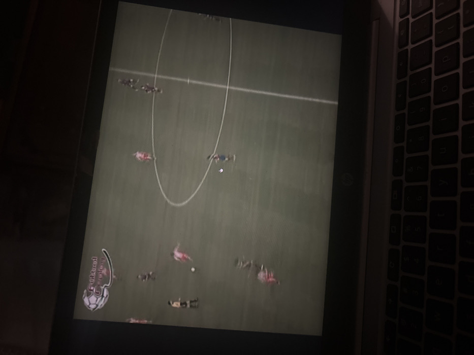 A soccer game is displayed on a laptop screen. The view is aerial, showing players in red, black, and yellow jerseys spread across the green field. A curved white line, likely marking the penalty area, is visible. The image is a bit grainy. A logo is in the lower left corner of the screen. Part of the laptop keyboard is visible on the right.
