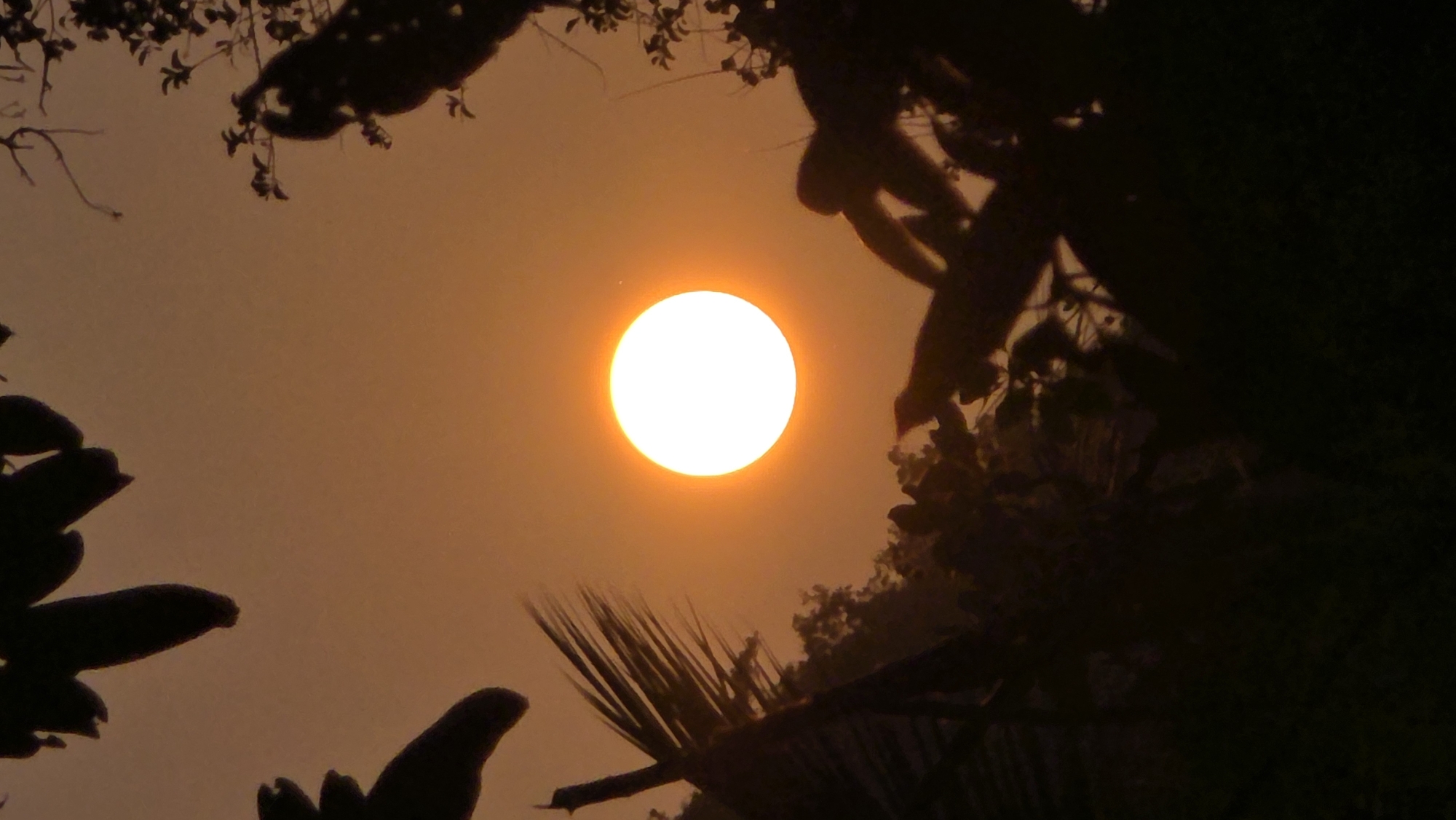 Captured from within Bac Natural Heritage Area Trang, Vietnam, the image frames a bright sun centered in the sky, with the surrounding sky taking on an orange hue. Dark silhouettes of foliage border the image, both at the top and bottom, hinting at a dense, natural environment. A palm frond is also visible in silhouette in the lower portion of the frame.
