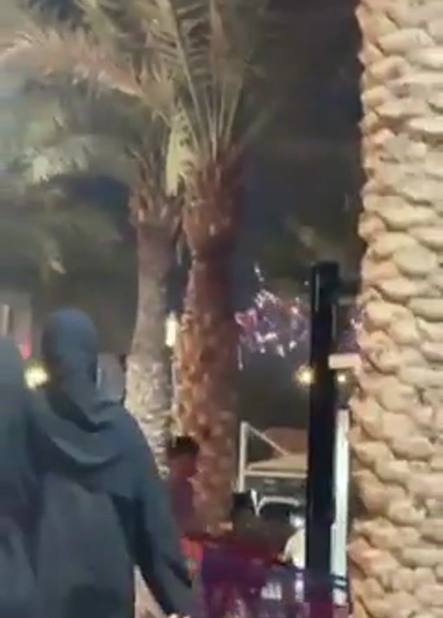 street scene at night. Several palm trees are visible, standing tall with illuminated lights and signs in the background. People are walking, including a person in a black robe. Fireworks explode in the distance, adding a festive ambiance to the scene.
