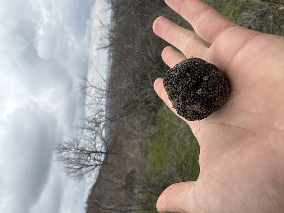 A forensic description of the scene in Balvan, Bulgaria, depicts a human left hand, palm up, holding a single, irregularly shaped black truffle