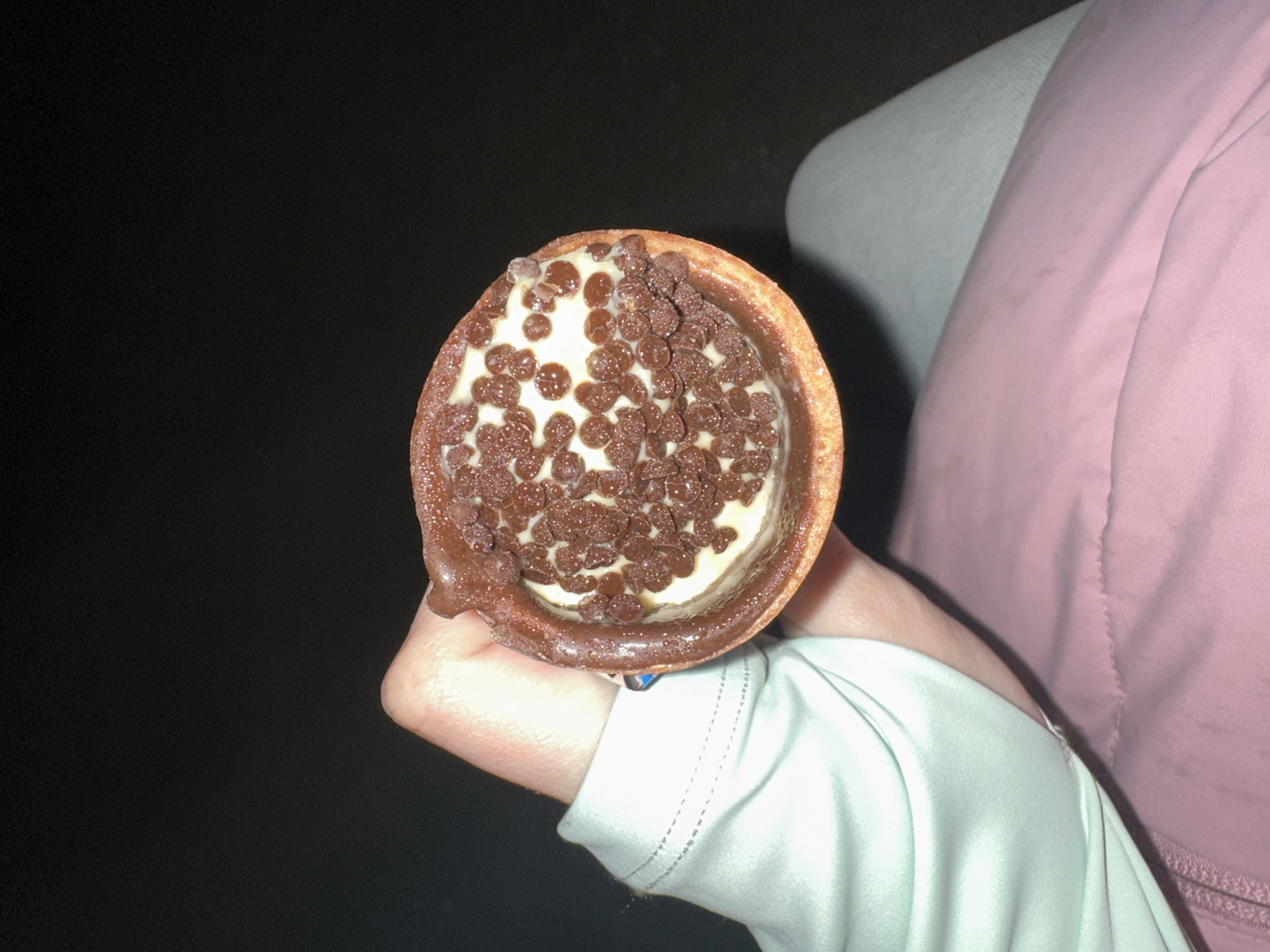 A person is holding an ice cream cone in their hand. The ice cream cone has a waffle cone with a chocolate coating around the rim. The ice cream itself appears to be vanilla, covered with mini chocolate chips. The person's hand is wearing a light green or blue long-sleeved shirt. The person is wearing a light pink vest or jacket. The background is dark, possibly indicating an indoor setting or nighttime outdoors. There is no indication that this image was taken in Moscow, Russia.