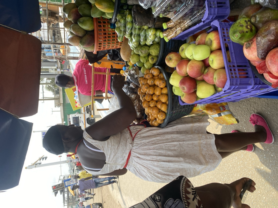 The image captures an outdoor market scene in Ablekuma, Ghana, under bright daylight, situated on a paved road at a busy intersection. In the foreground, facing away from the viewer, an adult female with dark skin stands, wearing a light-colored, possibly cream, patterned sleeveless dress with a red tie around the waist. White bra straps are visible on her back. She wears pink flat shoes. Her hands are positioned near a black plastic basket filled with numerous small, round orange fruits. To her right, a purple plastic crate contains red and green apples. The market stall extends to her right, displaying various produce. An orange plastic basket holds a large quantity of ripe mangoes. Below and to the right, green papayas and stacks of green fruits, some wrapped in clear plastic, are arranged. A lower black bowl contains pomegranates and avocados. Various small items in clear plastic bottles are also visible. In the mid-ground, slightly to the right, another individual, seen from behind, wears a bright pink t-shirt with "CANTEEN STAFF" printed on the back and a dark cap. This person holds a white basin or bowl. Above the market stall, a dark blue or black market canopy is partially visible. The background reveals a street with pedestrian and vehicular traffic. A multi-lamp traffic light pole is prominent on the left. Pedestrians, including a man in a purple shirt and jeans, are visible walking on the street. A white van is present on the road. Distant buildings, some appearing to be under construction, line the street under a clear sky.