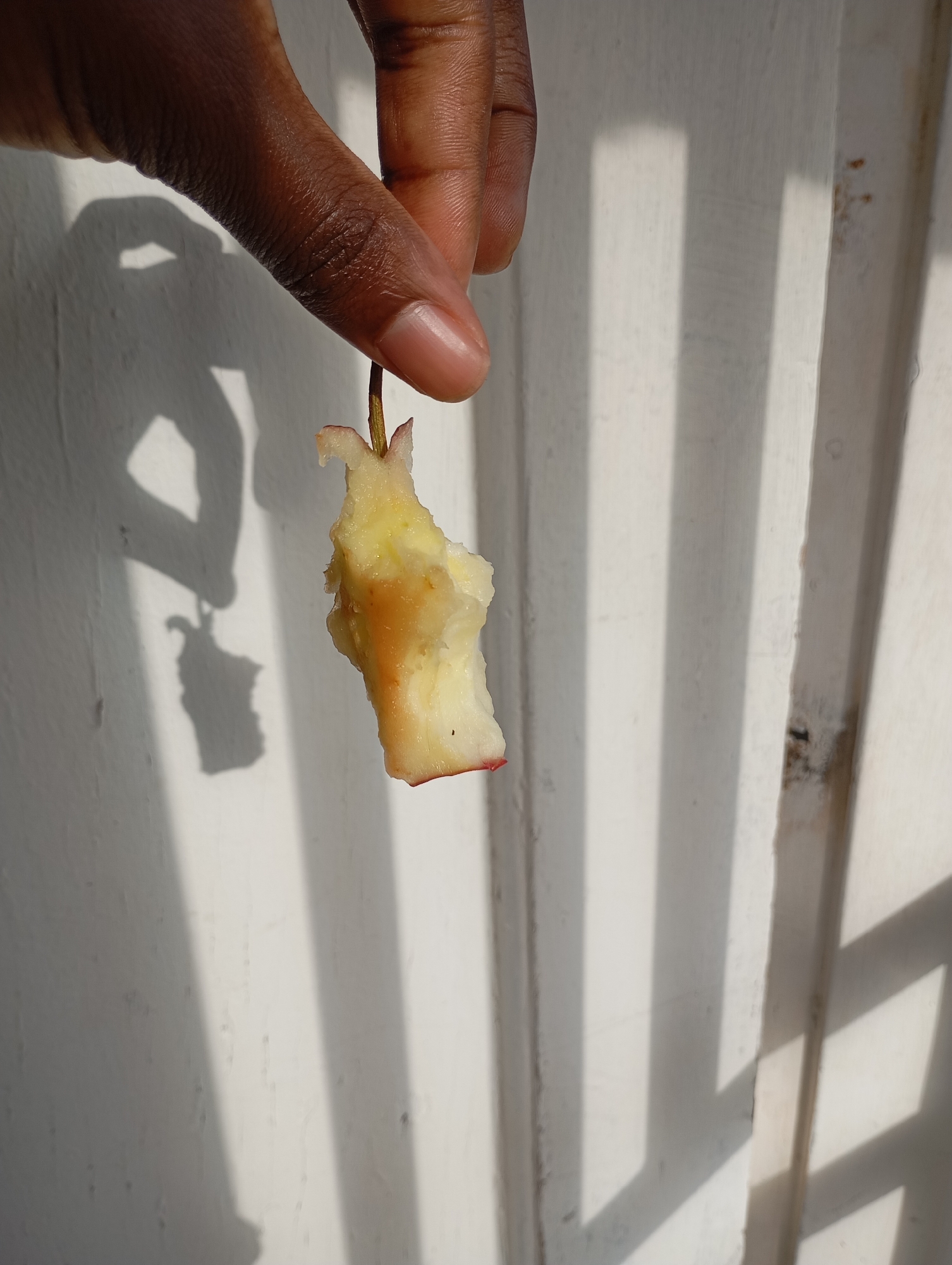 A dark-skinned human hand is depicted in a close-up, holding a partially consumed apple core between the thumb and index finger. The apple core is light yellow with remnants of reddish skin at the bottom and sides, exhibiting irregular bite marks. A brown stem is visible at the top of the core where it is gripped. The background consists of a light-colored, possibly off-white, textured vertical surface, resembling a wall or fence. Strong directional light illuminates the scene, casting multiple distinct, parallel vertical shadows onto the background, suggestive of slats or bars. A blurred shadow of the hand and the apple core is also visible on the wall to the left. Minor dark discolorations are present on the background surface in the mid-right area. The specific location within Johannesburg, South Africa, is not identifiable from the visual content of the image.
