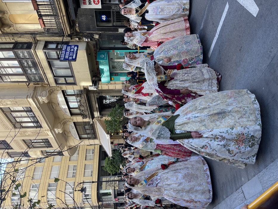 - "A daytime street-level image depicts a procession of approximately two dozen females in traditional Valencian Fallera costumes, walking from left to right on a paved street in Valencia, Spain" by FM-D8nzh1, licensed under CC BY 4.0