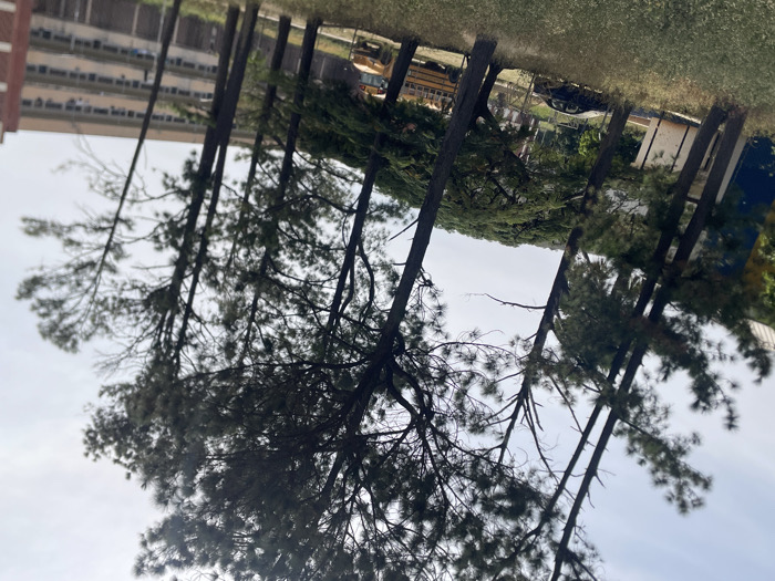 The scene is an outdoor environment in Naraguta Hausawa, Nigeria, observed under an overcast or hazy white sky. The lower third of the image is occupied by dry, light-colored grass and sparse vegetation. Seven or more tall, slender coniferous trees with dark trunks and dark green foliage extend vertically across the midground, with some leaning slightly. Behind the trees, from left to right, a section of a white building with a blue-painted lower facade is visible. A dark-colored sedan is parked on an unpaved surface to the right of the white building. Further right, partially obscured by tree trunks, a yellow school bus is also parked on an unpaved surface. In the background, on the right side of the frame, a large, multi-story building with a light brown or beige facade and numerous horizontal windows is prominent. No individuals are present, and no actions or interactions are depicted.
