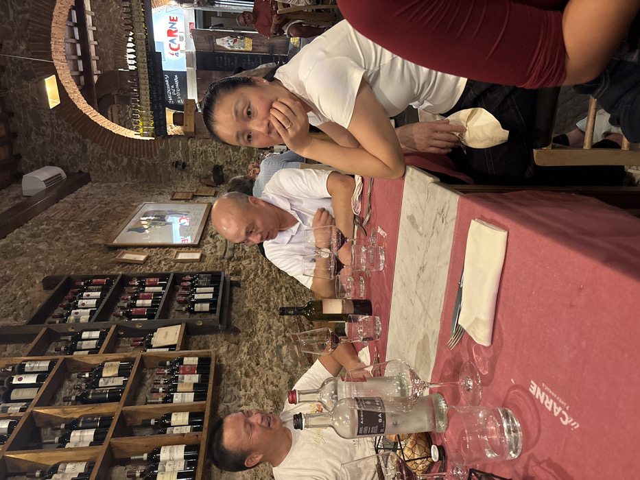 The image depicts an indoor restaurant scene in Livorno, Italy. Three East Asian individuals are seated at a long table. The male on the left, with short dark hair and a white t-shirt, is smiling and looking towards the center male. The bald male in the center, wearing a white polo shirt, is facing left, appearing to engage in conversation with the first male. The female on the right, with dark hair pulled back and wearing a white t-shirt and dark pants, rests her left hand on her chin, gazing slightly off-camera with a neutral expression. A ring is visible on her left ring finger, and she holds a crumpled white item in her right hand. The table features a white marble or stone top partially covered by a red tablecloth displaying the "iL CARNE" logo. Items on the table include two glass bottles of "ACQUA SAN FELICE" water, one dark wine bottle, multiple stemmed wine glasses (some containing red liquid), several tumblers (some with clear liquid), and cutlery (forks and knives) wrapped in white napkins. A small woven basket containing dark items is also present. The background consists of rough-hewn stone or brick walls. Wooden shelving units filled with numerous wine bottles are mounted on the left wall and above a stone archway in the rear. The archway leads to another section of the establishment, where a sign displaying "iL CARNE" in red letters is visible. Several indistinct figures of other patrons are visible in the background, including a male in a red shirt seated through the archway. An off-white air conditioning unit is mounted on the left wall near the ceiling. A framed picture hangs on the stone wall between the wine shelves and the archway. The lighting is dim and ambient.