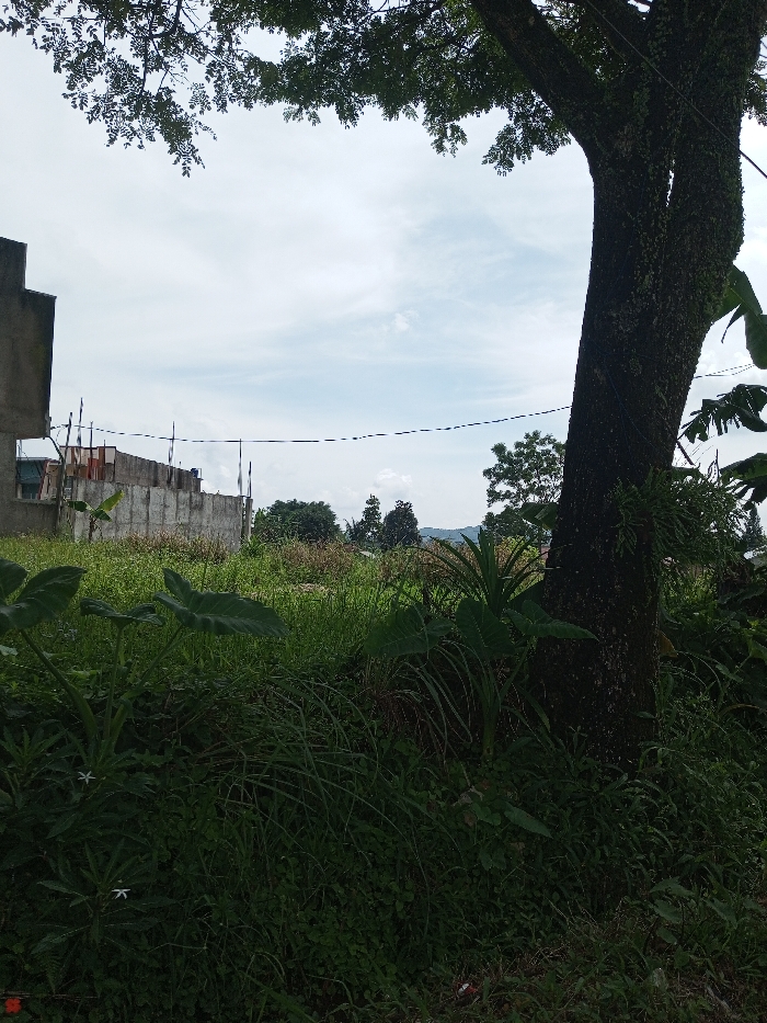 The scene, located in Namthoung, Laos, depicts an overgrown, undeveloped plot of land under a bright, partially cloudy sky