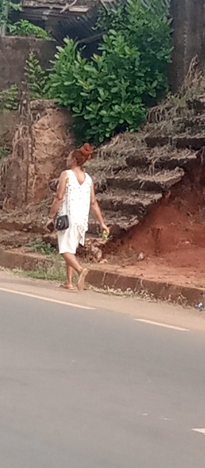 The image displays a daylight scene in Nkpor, Nigeria. A female individual, seen from behind, walks on a dirt shoulder alongside an asphalt road. She has reddish-brown hair pulled into a bun and wears a white sleeveless top/dress and white shorts/skirt, with light-colored sandals. A black shoulder bag hangs from her left side, and a yellow-green object is held in her right hand. The asphalt road, featuring a white line, occupies the lower frame. A concrete curb separates the road from the earthen shoulder, which has sparse green growth. Behind the shoulder, a steep reddish-brown earthen bank rises, showing visible terracing or rough steps and dense green foliage. An indistinct dark structure is partially visible through the vegetation in the upper left background.