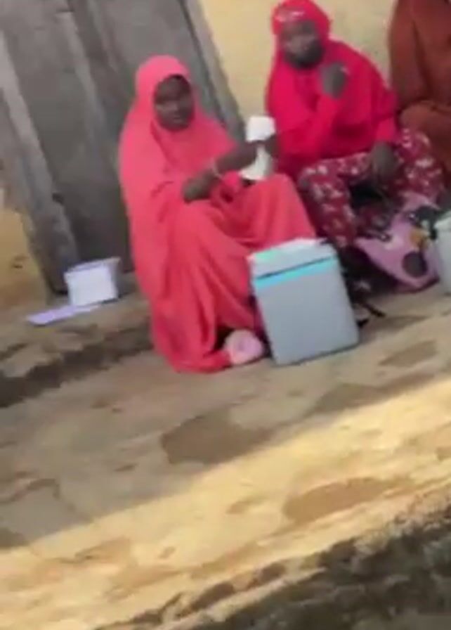 group of people sitting outside a building. There are two women in red hijabs and patterned pants, one counting money. There are two grey coolers near them. A man sits nearby in a light blue outfit and white shoes. He is looking at the group. The camera moves to show a dark wooden door and two women smiling and laughing with a white tube. The video ends with the shadow of the videographer.