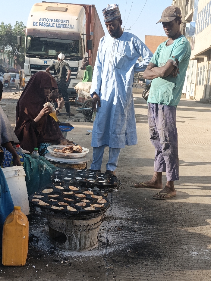 A bustling street scene shows a woman in a hijab selling food from a stall with cooking pans atop charcoal stoves. A man in a blue robe and cap stands nearby, along with another man in a t-shirt and cap, both appearing to observe the food preparation. In the background, people mill about, including figures near a large truck and on a cart. The ground appears dusty and worn, typical of a roadside market.