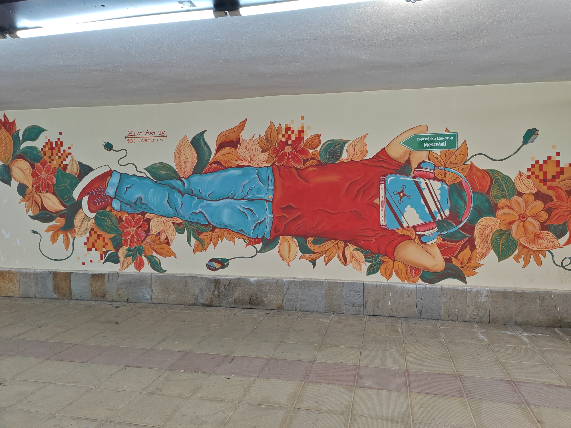 wall mural in an underpass. The mural depicts a reclining figure with blue jeans and a red shirt. The figure appears to be connected to various electronic devices via cables and has a backpack or bag that resembles a tablet or screen. The figure and devices are surrounded by decorative foliage and pixelated designs. A sign points to "Търговски Център WestMall," indicating the location is near WestMall in Sofia, Bulgaria. The wall is a light beige color, and the floor of the underpass is made of square tiles in various shades of beige and pink. There are some stains and imperfections on both the wall and the floor. Fluorescent lighting fixtures are visible on the ceiling above the mural.