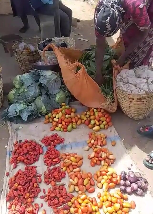 A woman wearing a pink floral dress and headscarf is standing behind a cloth laid out on the ground at an outdoor market, arranging leafy greens into a basket. Spread out on the cloth are piles of red chilies, orange-red tomatoes, and purple onions. To the left of the cloth are several heads of cabbage and two woven baskets. A light brown canvas bag is partially open, also containing leafy greens. In the background, a person is sitting on a stool. The ground appears to be a mix of dirt and concrete. The scene is brightly lit.