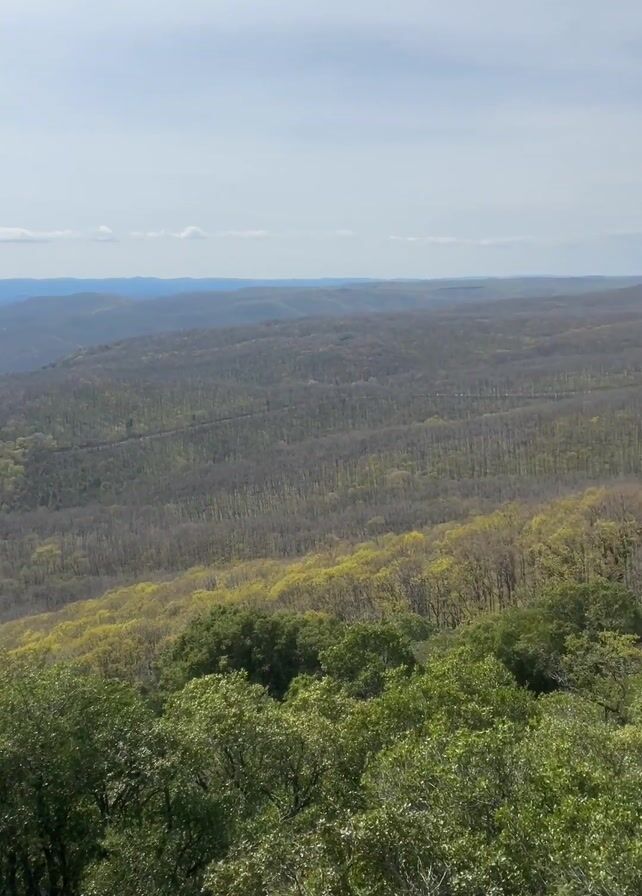 wide-angle view of a mountainous landscape under a bright, slightly cloudy sky. The foreground features lush green trees and a rocky terrain covered in lichen. Beyond this, the scene reveals a vast expanse of rolling hills and valleys, largely covered in a mix of trees, some with bare branches and others showing signs of new spring growth. In the distance, faint outlines of further mountain ranges can be seen under the hazy sky. The overall scene is peaceful and conveys a sense of natural grandeur.