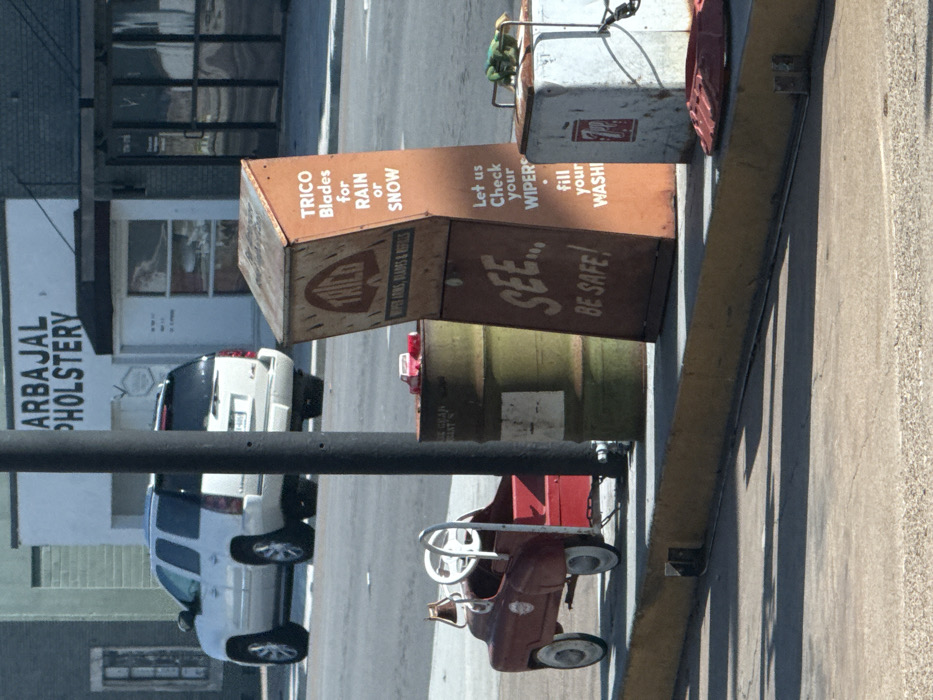 A faded, vintage advertisement for Trico wiper blades stands prominently. The sign reads "Trico Blades for Rain or Snow," urging customers to "See... Be Safe!" with a recommendation to check and fill their wiper wash. The sign's weathered appearance suggests a bygone era. Nearby is a child's red pedal car adding a touch of nostalgia. In the background, a glimpse of a building labeled "Arbajal Pholstery" can be seen, along with two white vehicles.