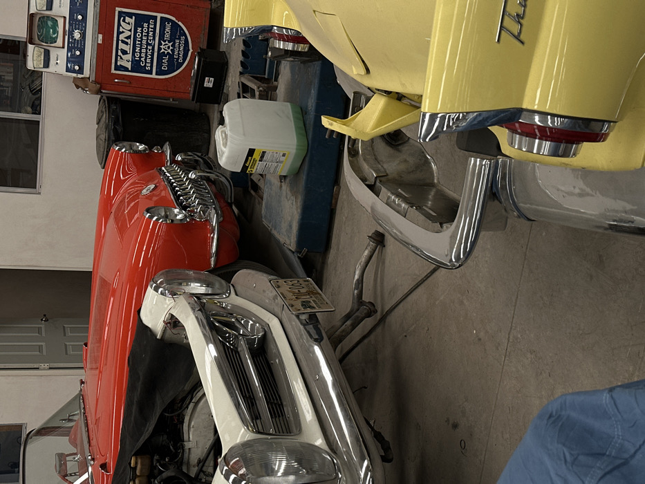 A red and white vintage car are parked next to a yellow car. A partially obscured white plastic container sits on a blue service lift between the vehicles. In the background are service tools and a diagnostic machine with a "King" logo. The cars are arranged in an indoor garage setting.
