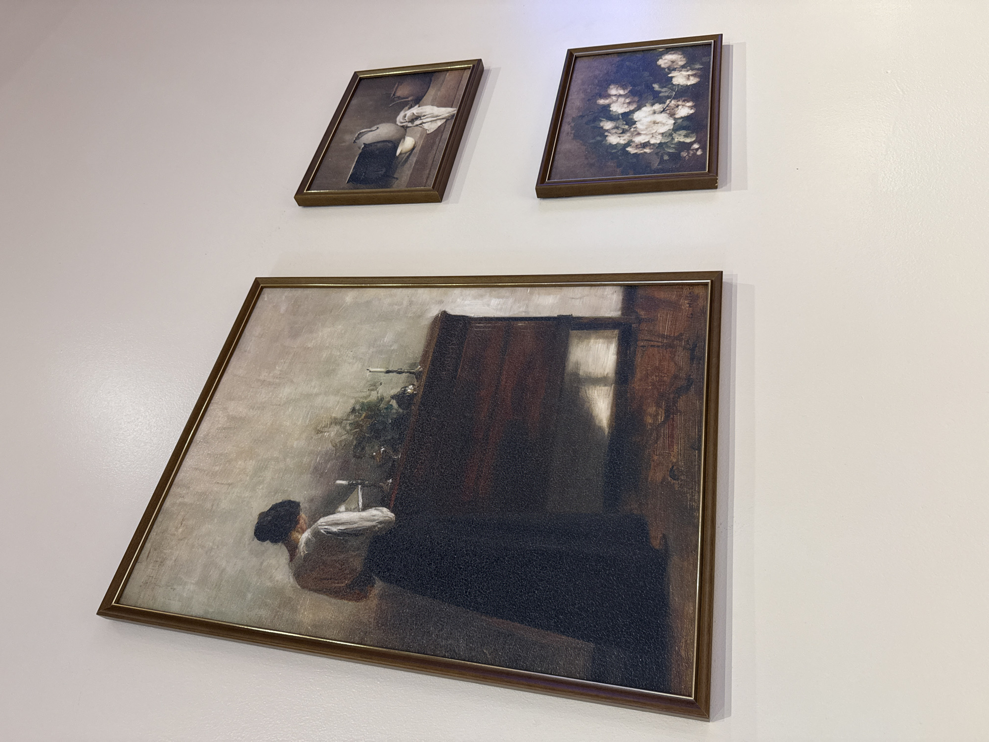 The scene depicts a light-colored interior wall, likely off-white, in an unspecified location within Unknown, United States. Three framed paintings are mounted on the wall. The largest painting, positioned on the left, is oriented vertically. It features a dark brown frame with a narrow gold inner border. The artwork portrays a woman, seen from behind or slightly to her left, dressed in a light top and dark, flowing skirt. Her hair is styled in a bun. She stands before a dark wooden dresser or cabinet, upon which a candle in a holder, a plant, and other indistinct items are visible. The painting employs muted tones and an impressionistic or realistic style. To the right of the large painting, two smaller, horizontally oriented paintings are displayed. Both possess dark brown frames with thin gold inner borders. The upper right painting depicts a still life with a white pitcher or jug, a small light-colored bowl, and a white cloth on a dark surface, against a dark background. The lower right painting features a floral composition of white or light-colored roses or similar flowers with green foliage, set against a dark backdrop. The wall surface appears smooth, with subtle variations in light and shadow, indicating ambient indoor illumination. No other objects or individuals are present in the immediate environment.