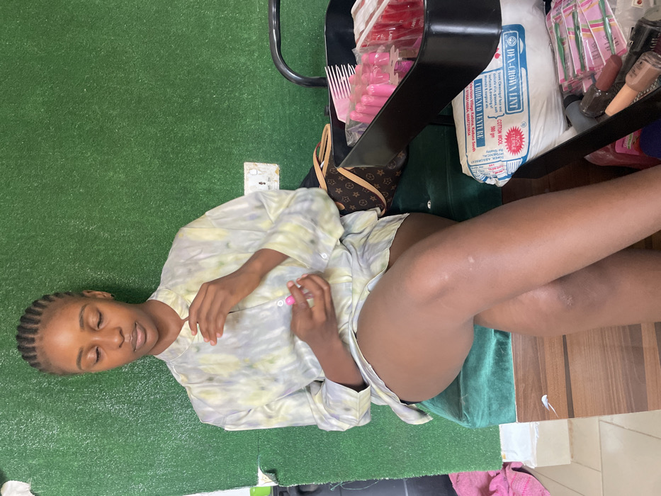 An adult female is depicted seated indoors on a dark green velvet bench, facing forward with her eyes closed. She wears a light green and grey tie-dye collared shirt with matching shorts, and her legs are crossed at the knees. Her hair is styled in dark cornrows. She holds a small, pink, cylindrical object between her hands, which are positioned near her chest. The background is a wall covered in green artificial turf. A white electrical outlet is mounted on this wall to the left of the subject. To the subject's right, a brown, monogrammed handbag rests on the bench. Adjacent to the handbag is a black, multi-tiered utility cart. The top tier of the cart contains numerous individually packaged pink combs and applicators. The middle tier displays a white bag labeled "DEX CROWN LINT COTTON WOOL NON STERILE 500 gm," which also bears the inscription "SABON TASHAS, KADUNA, NIGERIA" along with a partial phone number and address. The bottom tier of the cart holds various small bottles, consistent with cosmetic products. The flooring is a light-toned wooden material. This scene is located in Sabon Tasha, Kaduna, Nigeria, and appears to be within a salon or beauty establishment.