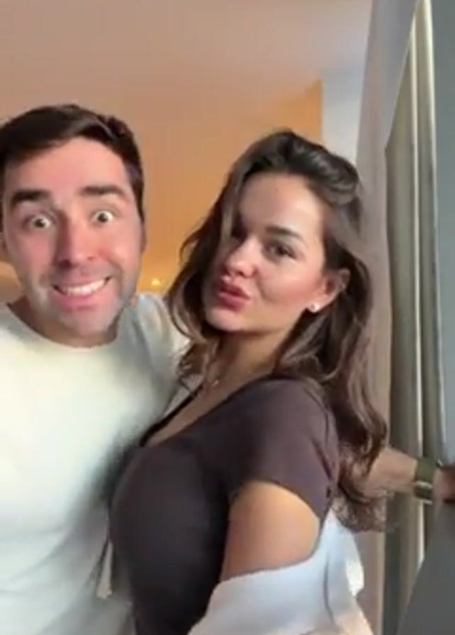 A couple stands in front of a light-colored door. The man wears a white shirt, while the woman wears a brown shirt and has a cream-colored jacket draped over her shoulders. The woman wraps her arms around the man, kisses his cheek, and then kisses his lips. The man is smiling widely.