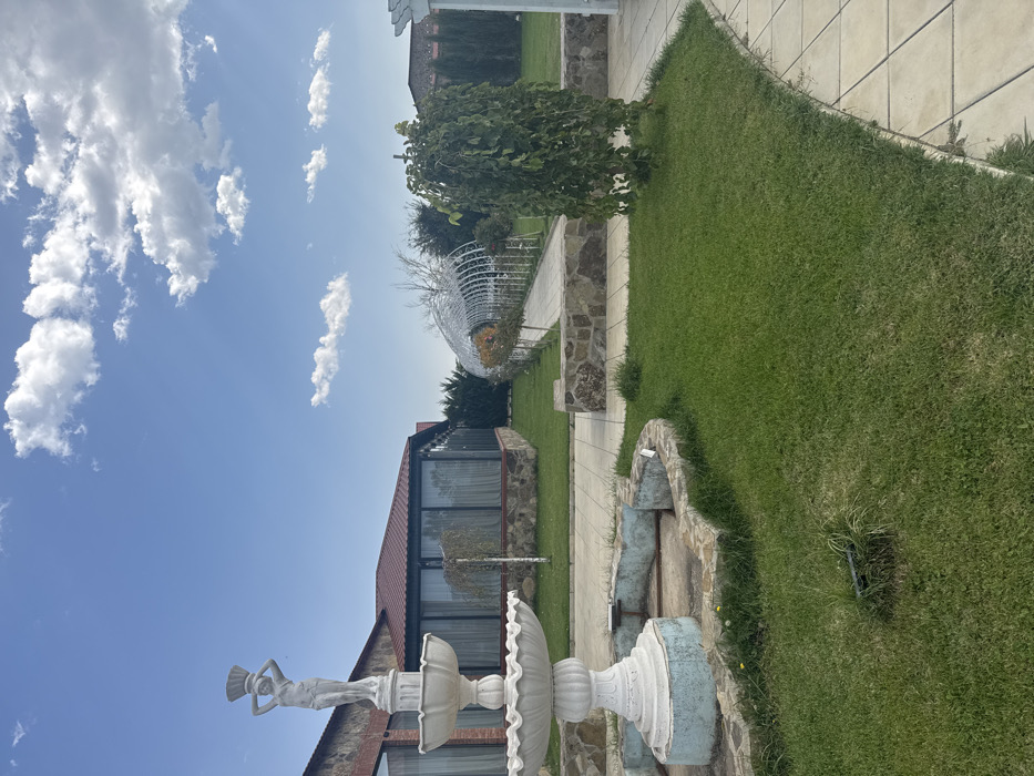 The image depicts an outdoor area in Kvakhvreli, Georgia, under a clear blue sky with scattered white cumulus clouds. In the immediate foreground, to the left, is a weathered, multi-tiered white concrete fountain topped with a statue of a female figure holding a basket on her head. The fountain's basin is empty, discolored with a pale blue-green hue, and contains some debris and sparse vegetation. Adjacent to the fountain and extending across the lower half of the frame are patches of green grass, some appearing manicured, while others show signs of sparse growth and weeds. Light-colored, square-tiled pathways are visible on the right side and between the grass sections. Stone-faced planters or low walls separate some of the grass areas and pathways. In the midground, to the left, is a single-story building featuring a reddish-brown tiled roof, a lower facade constructed of irregular stone blocks, and large, dark-tinted glass windows or doors facing the viewer. Further into the midground, a long, white, arched metal pergola extends over a tiled pathway, leading towards the background. Various trees and shrubs are situated around the pathways and buildings, including a prominent, weeping-style tree with dense green foliage on the right side of the frame. The background consists of a hazy horizon line with additional distant trees and foliage, indicating an open landscape beyond the immediate garden area. No individuals or active interactions are present in the scene. The lighting suggests daytime conditions.