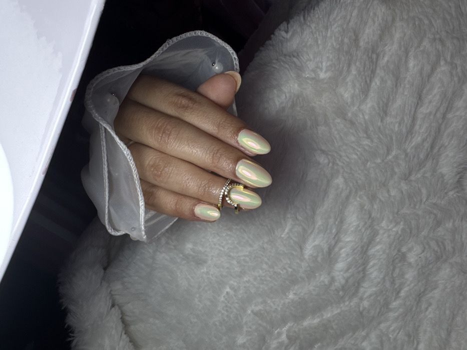 A right hand, adorned with iridescent pearlescent almond-shaped nails, rests on a white, fluffy, textured surface