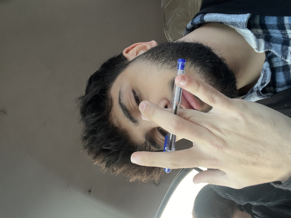 A man is photographed from a low angle. He has dark curly hair and a thick beard. He wears a blue and white plaid shirt under a black garment. He's holding a blue pen between his fingers, obscuring part of his face. A light fixture is visible below, and the ceiling is a light gray.