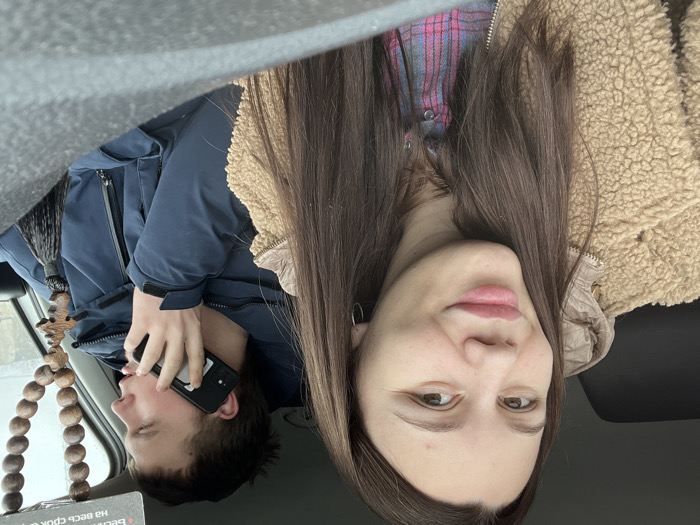 Two individuals are situated inside a vehicle in Leninavan, Russia. The foreground features a female with long, dark brown hair, wearing a tan fuzzy jacket over a plaid shirt, positioned in the front passenger seat. She looks directly at the camera with a slight smile. To her right and slightly behind, a male with short, dark hair, wearing a dark blue winter jacket, occupies the driver's seat. He holds a dark-colored smartphone to his right ear with his right hand and looks towards the vehicle's right side. A string of dark wooden prayer beads, featuring a wooden crucifix-like pendant and a dark tassel, hangs from the rearview mirror area. A partial sticker with Cyrillic text, including "бесплатно" (free) and "на весь срок" (for the entire term/period), is visible on the upper right side of the windshield. The exterior visible through the vehicle's windows is indistinct and appears overcast.