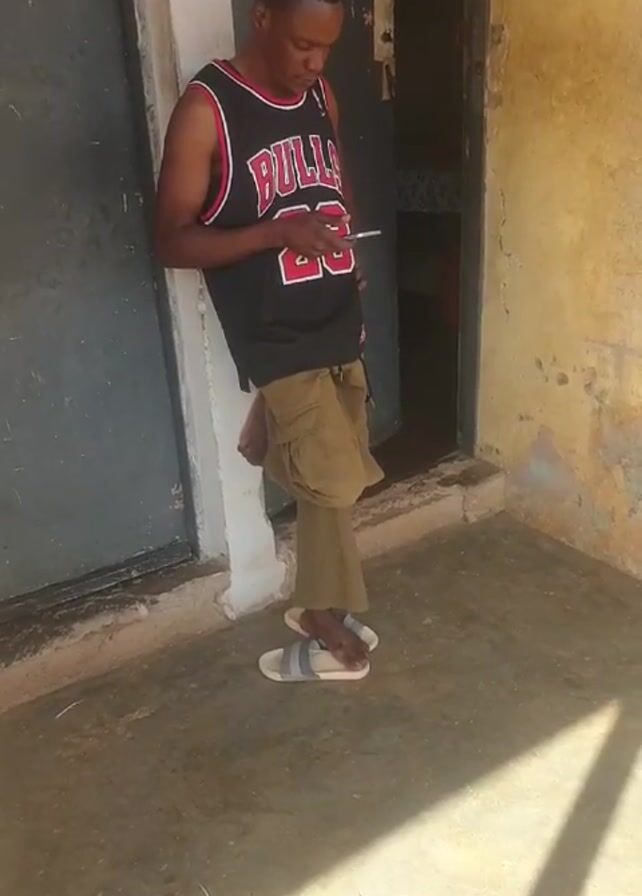 A man is leaning against a gray doorframe, wearing a black and red Chicago Bulls jersey with the number 23 on it, khaki cargo pants, and light-colored sandals