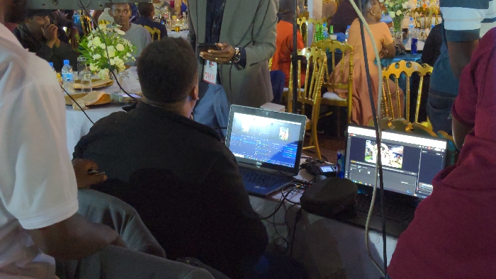 Two laptops are the focal point, both displaying video editing software. One shows a timeline, the other a preview. A person in a black shirt sits facing them, seemingly working on the project. A man in a suit stands nearby. The scene is cluttered, with tables, chairs, and people in the background. The event appears to be social, possibly a wedding reception, based on the floral arrangements and table settings. The overall impression is a behind-the-scenes glimpse of a video being edited at an event.