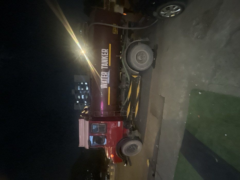 The image depicts a red water tanker truck parked on an urban street at night, likely in the Mumbai Metropolitan Area, India
