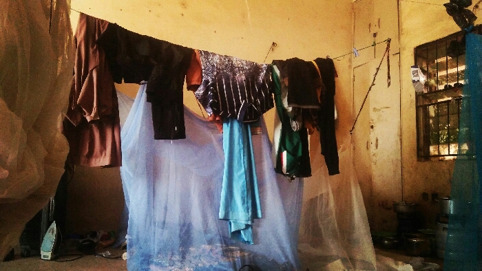 The image depicts an indoor scene within a room in Rijiyar Zaki, Nigeria. An off-white or yellowish wall serves as the primary background, exhibiting areas of discoloration and wear. A clothesline is stretched horizontally across the upper portion of the room, from left to right. Hanging on this line are several items of clothing: a brown long-sleeved shirt, dark trousers, a patterned dark shirt with white stripes, a light blue fabric item, and a green and white striped garment. Clothespins are used to secure the laundry. A large, light blue mosquito net is suspended from the clothesline in the central area, extending downwards and obscuring the lower background. A lighter, beige-colored mosquito net is partially visible on the far left. On the floor in the mid-left section, a light blue and white electric iron with a dark power cord is situated. The right side of the room features a rectangular window secured with dark metal bars. Below the window, several metallic cooking pots and bowls are stacked on the floor or a low surface, adjacent to a tall, clear plastic container. A white utility box is mounted on the wall near the window. Between the window and the left half of the room, a light-colored, worn door or panel is visible on the wall. No individuals are present in the scene.