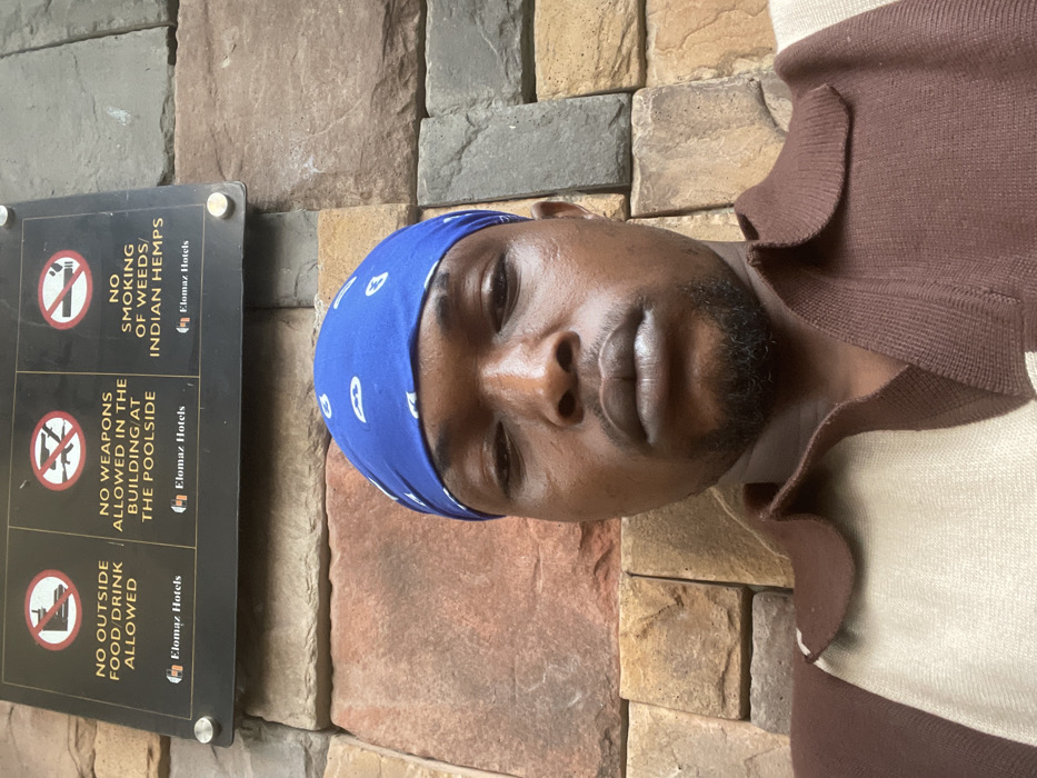 A man wearing a blue bandana and a brown-and-beige collared shirt stands next to a sign prohibiting outside food/drink, weapons inside the building/at the poolside, and smoking of weeds/Indian hemp, all marked as rules of Elomaz Hotels