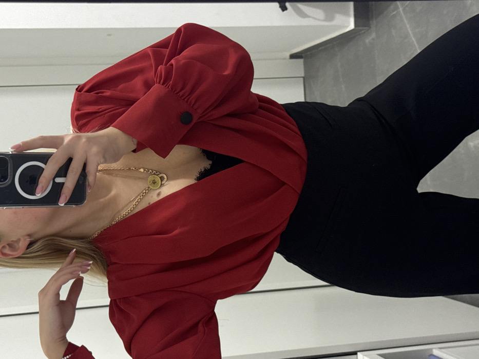 A woman in a red, long-sleeved blouse with black buttons and gold necklaces takes a mirror selfie. Her black pants are visible. She holds an iPhone in a clear case. A hint of black lace can be seen under the blouse. The background shows a modern, gray-toned room.