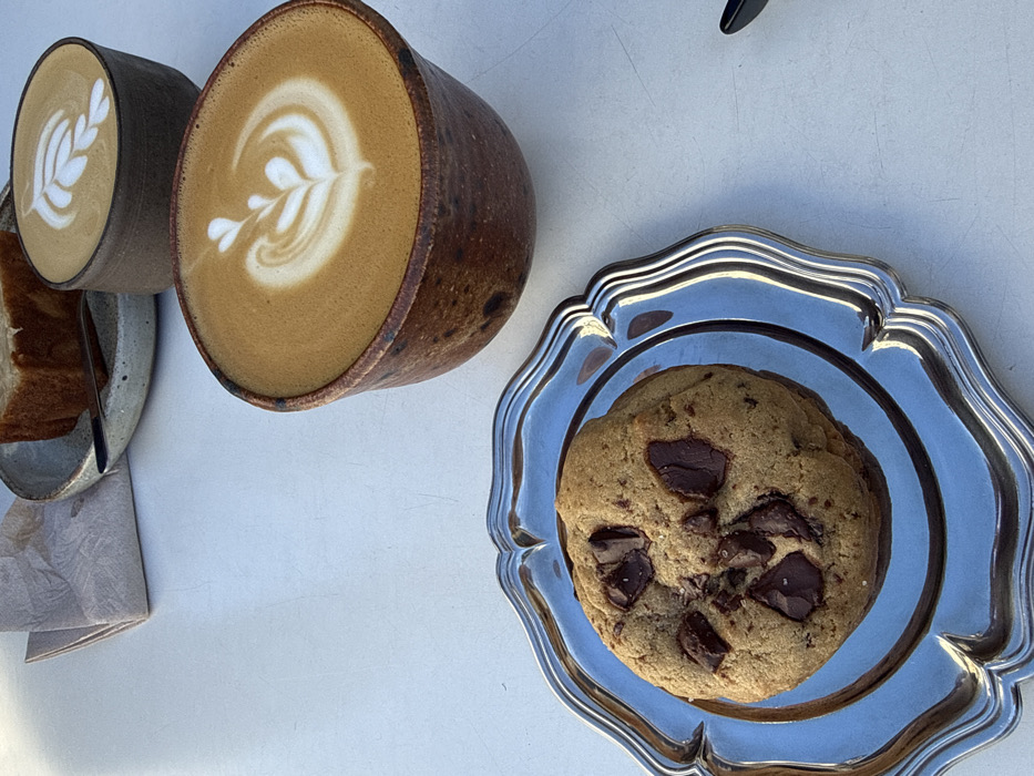 A white table surface, located in Biarritz, France, displays a selection of food and beverages. In the lower left quadrant, a chocolate chip cookie with prominent dark chocolate chunks rests on a small, ornate silver plate with a scalloped edge. To the right of this, a cylindrical, rustic brown ceramic cup contains a latte with a distinct white foam heart-leaf design. Further in the upper right background, another similar brown ceramic cup holds a latte featuring a simpler white foam leaf pattern. Behind these, a slice of light-colored cake or bread is presented on a small, round, grey ceramic plate with a fork resting upon it. A folded beige paper napkin is positioned near the cake plate. A small black utensil handle is visible on the far right edge of the table. No individuals are depicted.