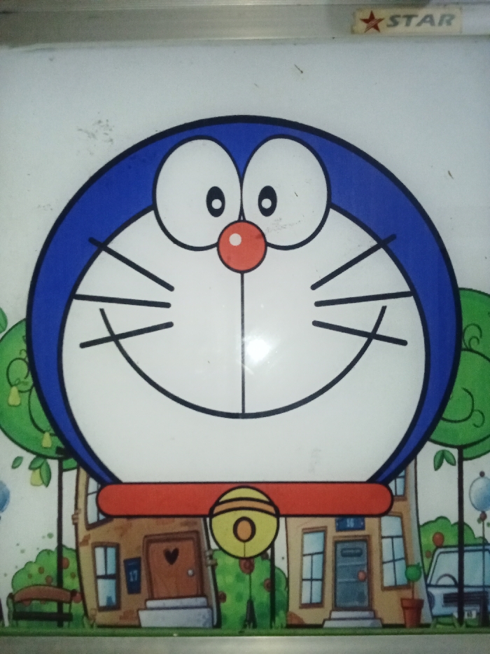 The image presents a detailed graphic of the cartoon character Doraemon, occupying the majority of the frame. Doraemon is depicted with a prominent blue outline around its head, a white face, two large white eyes with central black pupils, a small red circular nose, a broad black-lined smile, and three black whiskers extending from each cheek. Below the head, a red collar with a yellow bell is visible. The bell features concentric circles and a central dot. The lower portion of the image, beneath Doraemon's head, reveals a stylized cartoon neighborhood. This background includes simplified depictions of houses, green trees and bushes, a brown park bench on the left, and a partially visible light blue vehicle on the right. One house on the left has a brown door with a heart-shaped window and the number "17" on its side, while another house has a blue door. The graphic is printed on a white, slightly reflective surface, which exhibits minor scratches and dust particles. A thin metallic frame borders the top edge. In the upper right corner, a "STAR" logo, featuring a red five-pointed star preceding the capitalized word "STAR," is present. No individuals, direct actions, or interactions are depicted. The specific location within the city of Inxuba Yethemba Local Municipality, South Africa, is not discernible from the visual content of the image.